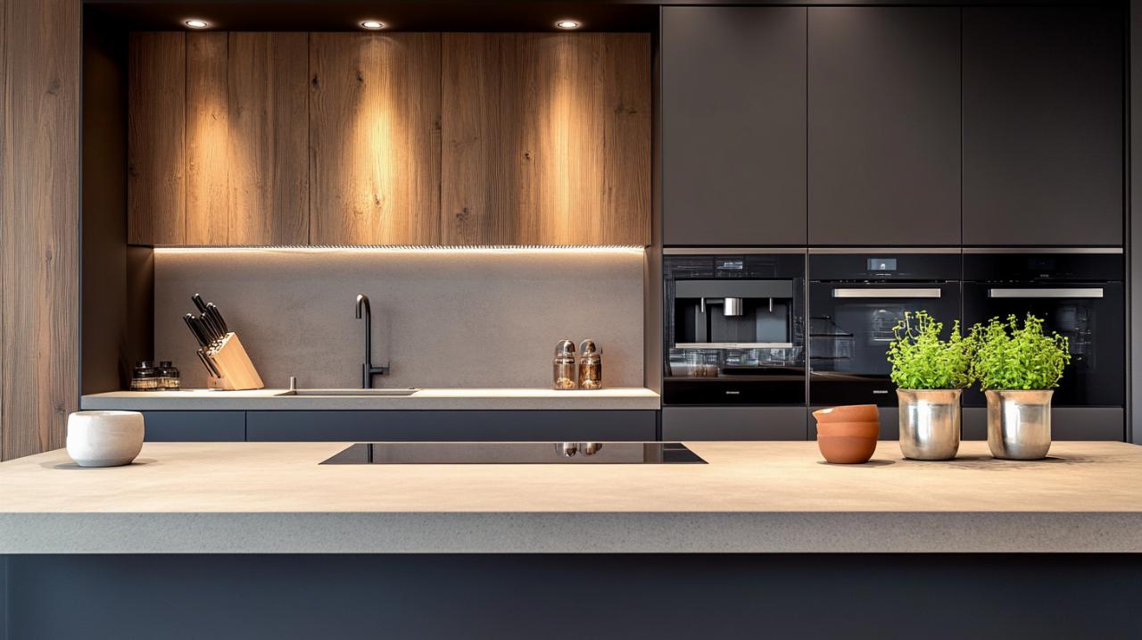 La céramique traditionnelle, bien que résistante aux taches et à la chaleur, peut se montrer plus fragile face aux chocs thermiques brutaux. Le Dekton, grâce à son processus de fabrication particulier, présente une meilleure résistance aux impacts et permet la réalisation de plans de travail de grandes dimensions sans joints apparents, ce qui constitue un avantage esthétique et pratique considérable.